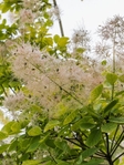 Листя велике, округле, насичено-жовте навесні та влітку (на сонці максимально яскраве). Восени переходить у теплі помаранчево-червоні відтінки. У червні–липні з’являються ажурні рожево-пурпурові «димчасті» волоті, що створюють ефект легкої серпанкової хмари.