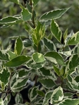 Листя сіро-зелене з широкою кремово-білою облямівкою, що створює ефект «світіння» у композиціях. Восени набуває рожево-бордових відтінків. Узимку декоративність забезпечують насичено-червоні пагони, які особливо ефектні на фоні снігу.