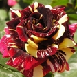 Ефектна чайно-гібридна троянда з унікальними строкатими квітами бордово-червоного кольору з кремово-жовтими смугами та штрихами. Цвіте рясно та повторно протягом сезону, формуючи компактний декоративний кущ. Чудово підходить для клумб, бордюрів і яскравих композицій.